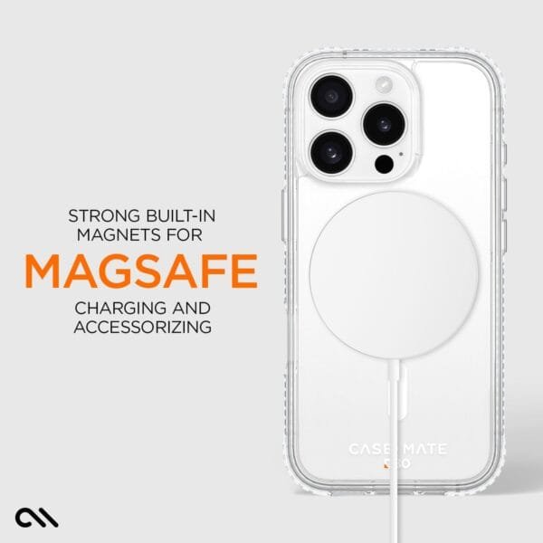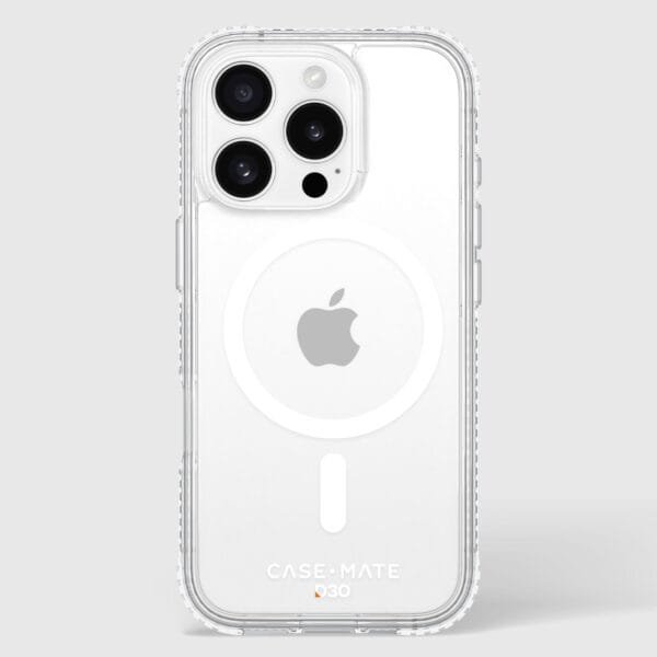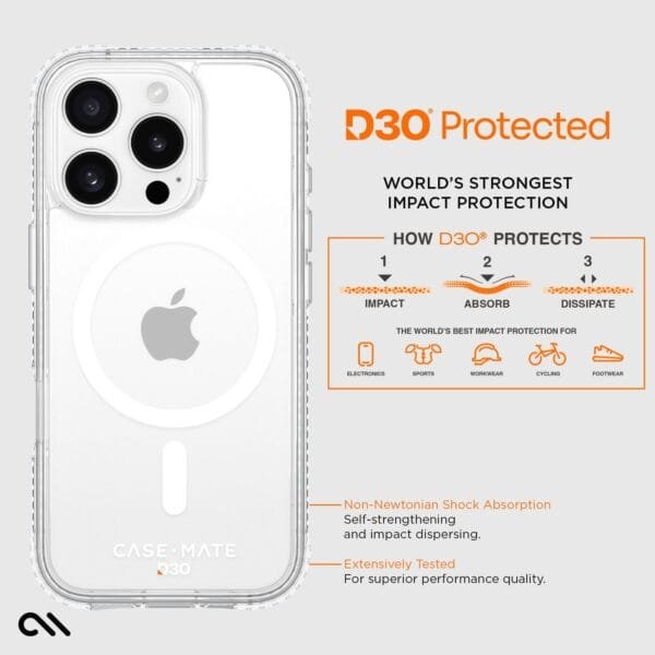 The Tough D3O® Clear MagSafe Phone Case for iP 16 Pro is built to last day and night. D3O® uses a self-strengthening. non-Newtonian technology that offers the thinnest. strongest. and the world’s best impact protection. The science behind this material is incredible– so yes. you can really drop it. With added D3O® protection. feel confident your phone is safe with 16-foot drop protection while strong built-in magnets allow for easy MagSafe accessorizing and charging.